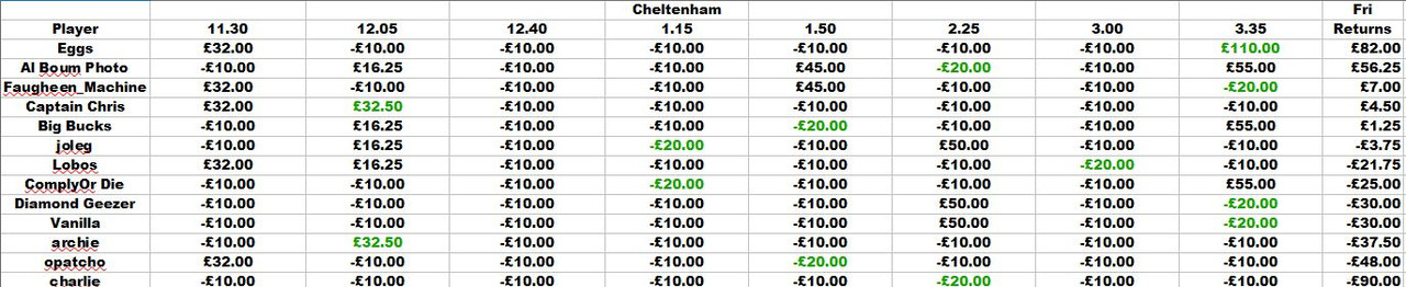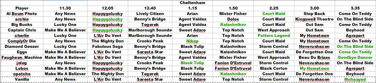 One selection each day in each race at Cheltenham from Friday and Saturday, with one selection each day noted as a nap. Selections each day must be in by the start of the first race and no alterations are permitted thereafter including the addition or changing of naps. NO EXCEPTIONS.